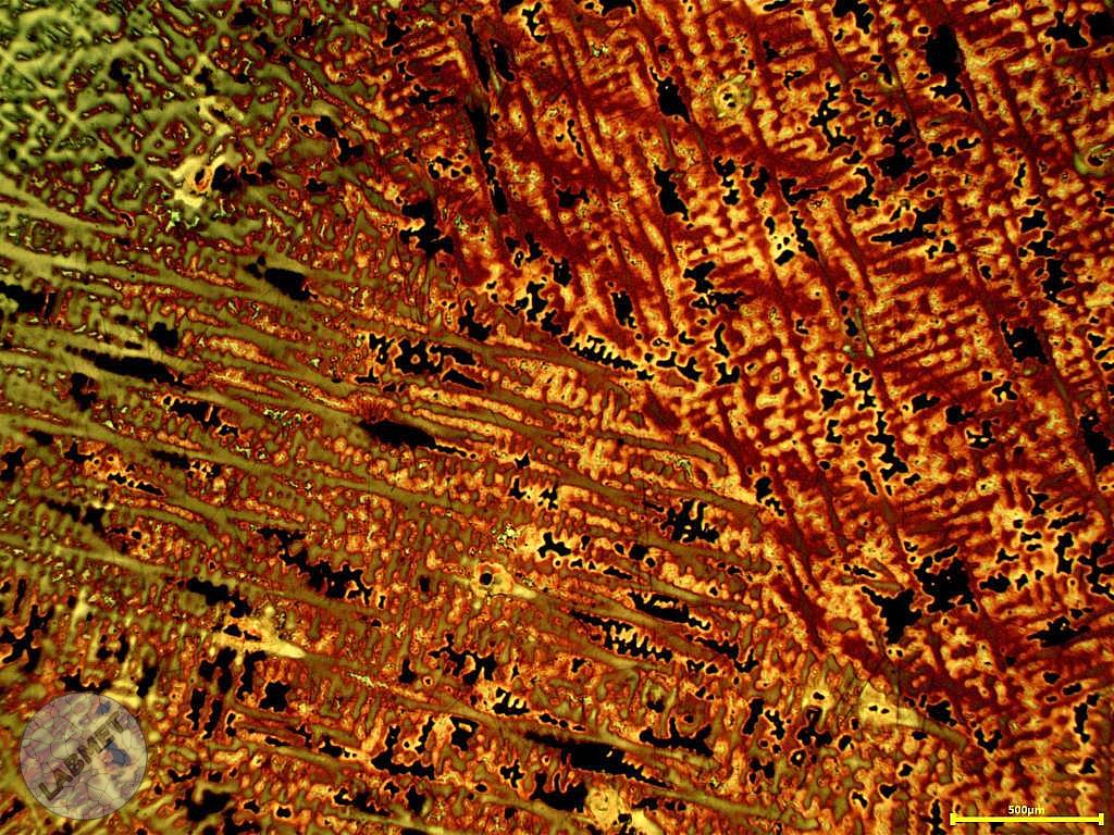 Struktura brązu cynowo-fosforowego w stanie lanym stosowanego głównie na części maszyn pracujące w warunkach tarcia. Trawiono barwne odczynnikiem Klemm'a III.