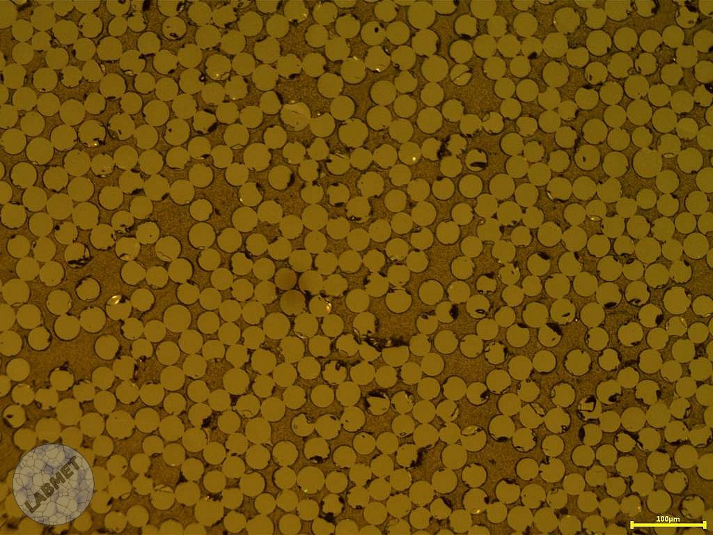 Struktura kompozytu z żywicy epoksydowej wzmacnianym długim włóknem szklanym ukierunkowanym osiowo zgodnie z kierunkiem działania sił obciążających kompozyt. Na mikrofotografiach przedstawiono przekroje poprzeczne kompozytu w odniesieniu do kierunku włókien szklanych.