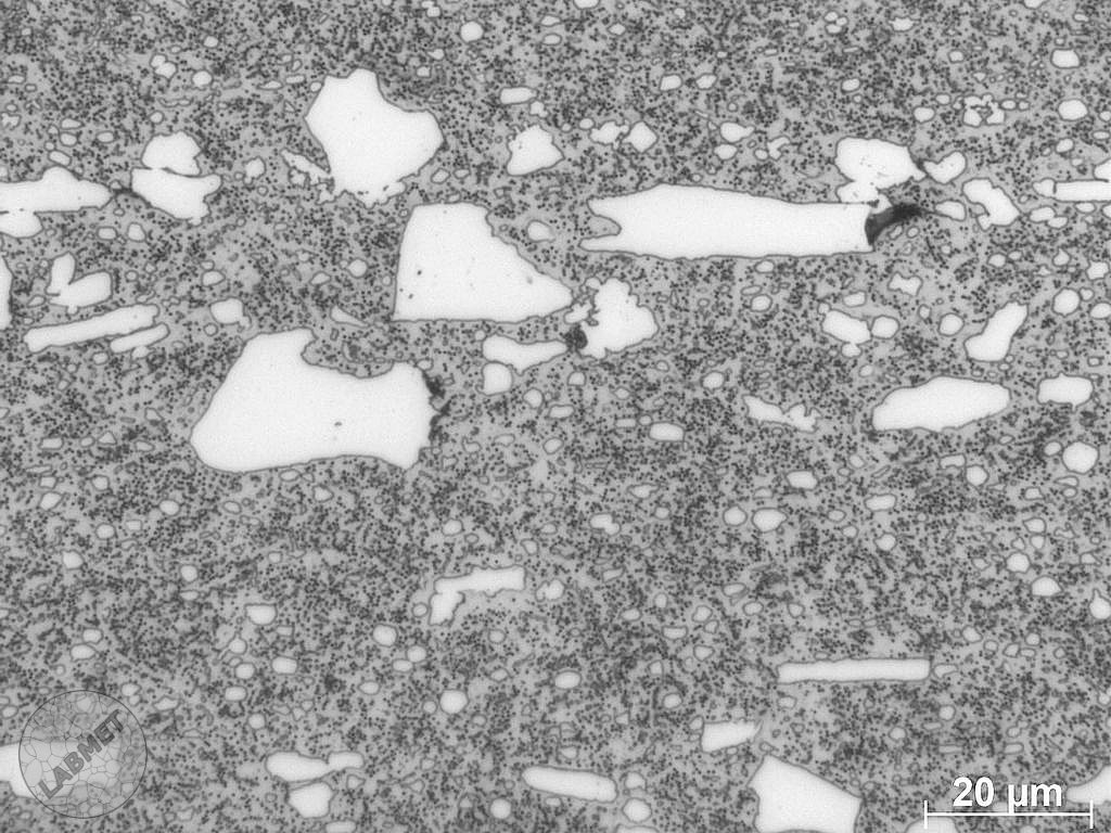 Wysokowęglowa, chromowa, ledeburytyczna stal narzędziowa do pracy na zimno. Mikrofotografie stali w stanie zmiękczonym (po sferoidyzacji) o twardości 245 HV (22 HRC). Zgłady trawiono pilralem oraz nitalem. Podczas trawienia pikralem uwidocznieniu uległy tylko węgliki. Wytrawienie nitalem spowodowało dodatkowe częściowe uwidocznienie zarysu granic ziarn.
